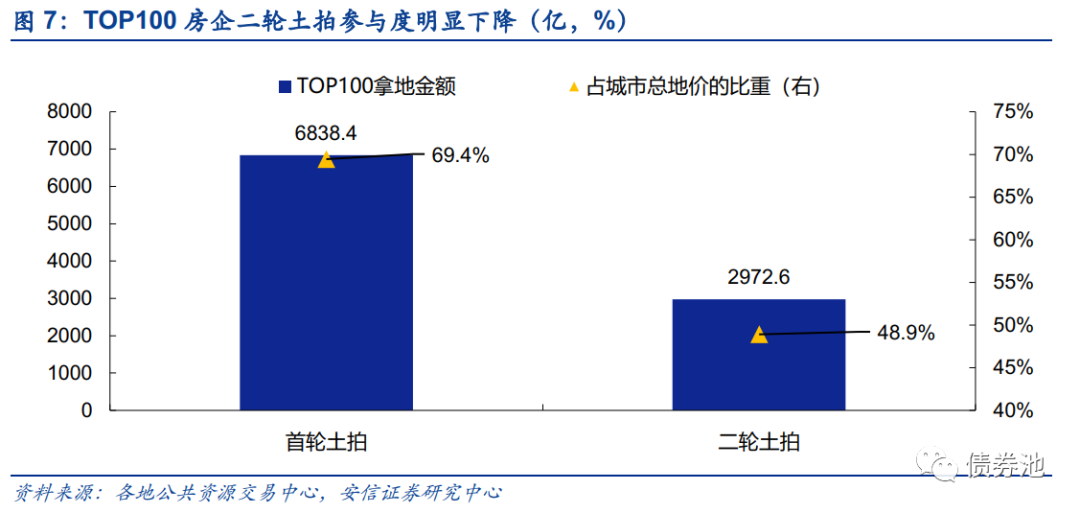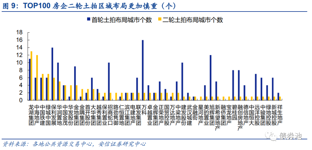 ■特征四:主流房企参与度普遍下降,城市布局更加谨慎。TOP100房企二轮土拍拿地金额共2972.6亿,占总成交额的48.9%,明显低于首轮的69.4%。主流房企在北广深锡等热点城市的参与度明显下降,拿地金额占城市总成交金额的比重由首轮的70%以上下降至50%左右。对于其他二线城市的选择上则更加慎重,部分城市参与度明显较低,重庆TOP100房企拿地金额占比仅8.3%。TOP100房企在拿地城市数量上也明显减少,除积极拿地的中海、保利等布局城市较多外,其余房企明显谨慎,碧桂园、绿地、招商蛇口等房企仅在1-2个城市拿地。