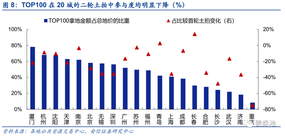 TOP100在20城的土拍中参与度均明显下降,城市选择上更加谨慎。TOP100房企在北广深、无锡等热点城市二轮土拍的参与度均明显下降,拿地金额占城市总成交金额的比重由首轮的70%以上下降至50%左右,其中无锡、深圳降幅超30%。上海由于土拍限制条件较为严格,TOP100房企拿地金额占比仅40.8%,明显低于首轮土拍的76.4%,其余地块多数被上海本地企业竞得。而对于其他二线城市,主流房企更加慎重,部分城市参与度明显较低,重庆首轮土拍中TOP100房企拿地金额占比达83.1%,而二轮土拍下降至仅8.3%,28宗地中仅2宗被中海5.7亿底价竞得、1宗被中国铁建7.8亿底价竞得,其余多数被重庆本地企业收入囊中。