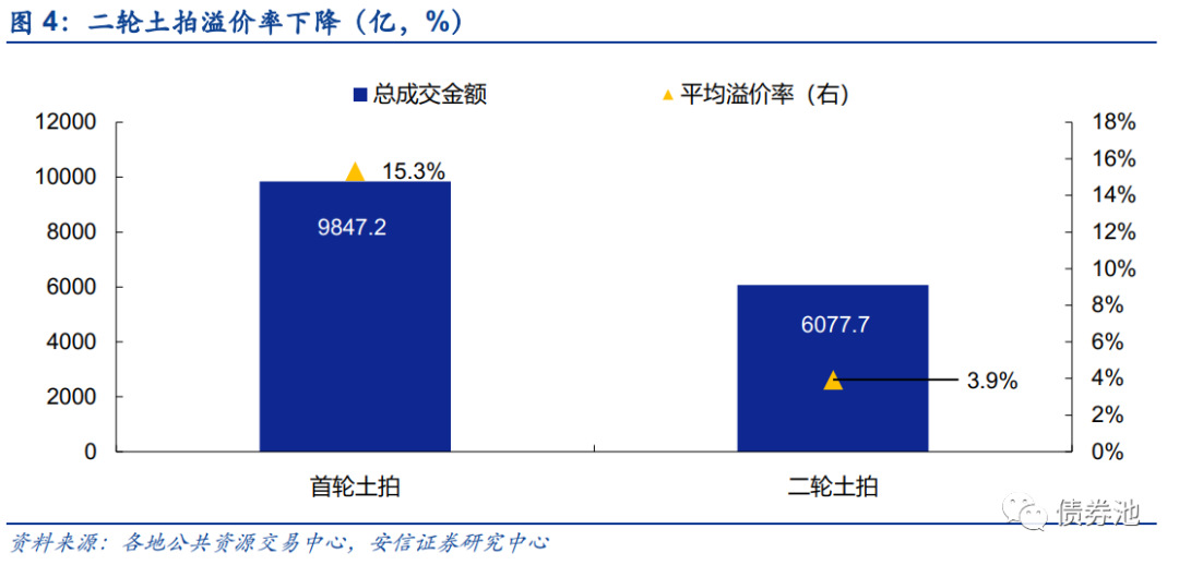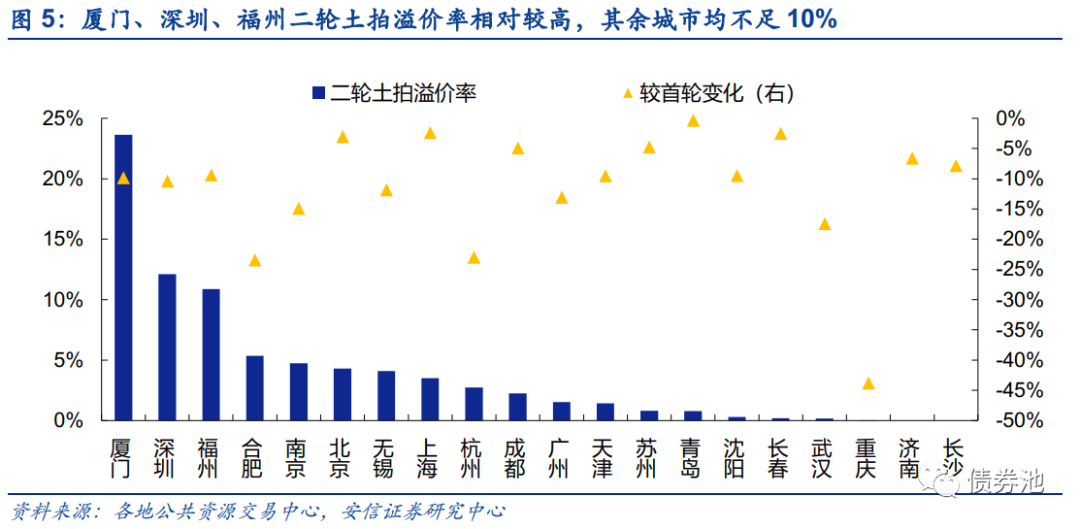 ■特征三:凉意明显,溢价率大幅走低。受规则调整、开发商拿地谨慎等原因,平均土拍溢价率由首轮的15.3%大幅下降至二轮的3.9%。热度最高的城市厦门平均溢价率23.6%,其次为深圳、福州,平均溢价率为12.1%、10.9%。其余17城中,一线溢价率受土拍规则限制普遍较低,北上广分别为4.3%、3.5%、1.5%;二线城市中,首轮土拍热度较高的杭州、南京溢价率降至5%以下,长沙全部地块底价成交,青岛、长春、济南、重庆、武汉超9成地块底价成交,溢价率大幅走低。
