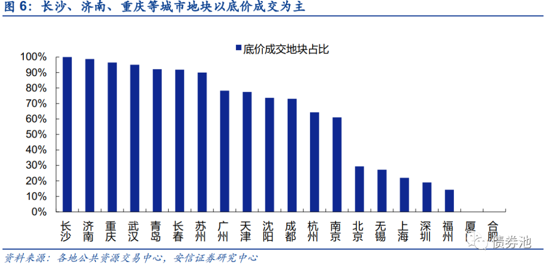 其余17城溢价率均明显走低。北京、上海、广州溢价率分别为4.3%、3.5%、1.5%,较首轮土拍分别下降3%、2.4%、13.1%。一线城市土拍溢价率限制严格,北京要求土拍整体溢价率不得超过10%,海淀区两宗触发报品质环节的地块溢价率限制在6%,其余地块溢价率也均在15%以下,上海地块溢价率均限制在9%以内。其余二线城市二轮土拍相对较冷,长沙全部地块底价成交,青岛、长春、济南、重庆、武汉超9成地块底价成交,首轮土拍热度较高的杭州、南京、合肥溢价率也下降至5%以下。
