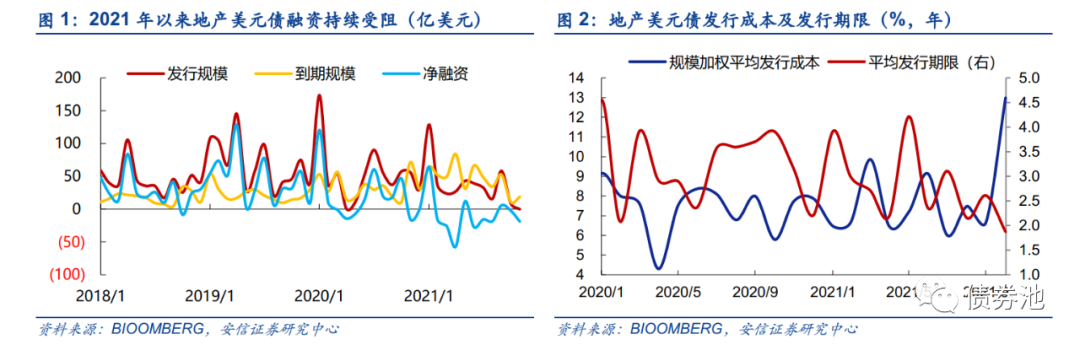 2021年以来地产美元债发行受阻,发行期限略有缩短。2021年以来,在房企负面消息的不断冲击下,地产美元债融资持续受阻。截至目前(2021年11月4日,下同)共发行地产美元债[1]135只,同降12.3%,发行金额413.7亿美元,同降27.6%,净融资为-98.9亿美元,明显低于去年同期的300.8亿美元。1-9月发行成本变动不大,10月受发行主体集中于弱资质影响成本有所上升,11月暂无地产美元债发行。发行期限略有缩短,1-11月平均发行期限为2.8年,短于去年同期的3.4年。