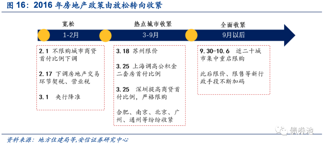 2014年以来持续宽松货币环境和房地产政策导致一二线房价暴涨,2016年3月,以苏州首推限价为起点,上海、北京、深圳、合肥等热点城市率先收紧调控。7月中央政治局会议强调“抑制资产泡沫”、10月强调“防风险”,2016年930前后,北京、深圳等20余个一二线城市集中收紧限购限贷,房地产政策正式进入紧缩周期。本轮放松周期持续2年左右。