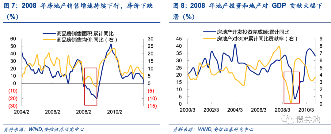 房地产市场的景气度也从2008年初开始大幅回落,房价出现明显下跌。2008年2月商品房销售面积累计同比转为负增长,由2017年末的23.2%降至-4.2%,2008年全年商品房销售面积同比-19.7%,创2000年以来新低,商品房销售均价则由2007年的上涨14.8%转为2008年的下跌2%。同时,房地产投资明显降速,对于经济的拉动作用显著减弱。2008年10 月国常会提出“降低住房交易税费、支持居民购房”,同月央行宣布下调首付比例、国税局宣布下调契税,房地产政策正式转向宽松。