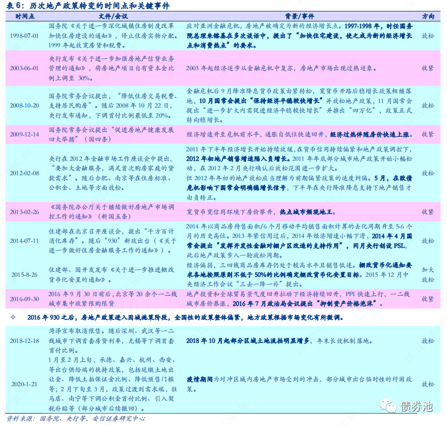 ■总结来看,1998年以来共经历了六轮房地产放松周期,其中,(1)1998-2013年之间的三轮放松,房地产更多被作为刺激经济的手段,政策走向与宏观经济相关联。(2)2014-2016年放松的主要目的是去库存;(3)2016年930以来,房地产政策进入跨周期调节阶段,“房住不炒”是政策主基调,房地产和经济的捆绑性下降。2018年末和2020年初的两轮地方政策放松持续时间较短,以政策微调为主,较少触及限购限贷等需求端政策的大幅放松。