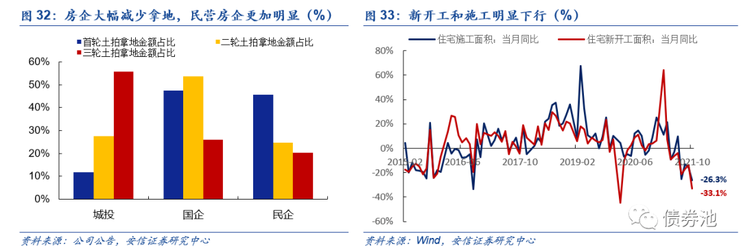 在“三条红线”与“贷款集中度”等监管政策约束下,用“表观存货”表征的样本房企合意库存在2021H1出现了首次下降。10月流动性危机加剧了房企现金流压力,民营房企为了能够“活下去”而极度珍惜现金流,大幅减少拿地,明显减缓新开工和施工,流动性危机带来的销售承压进一步强化了房企紧缩行为。三轮土拍金额明显下降,溢价率大幅走低,超过50%土地被城投拍得,民营房企在三轮土拍中的拿地金额占比从首轮和二轮的45.6%、24.7%进一步下行至20.3%,国企拿地金额也有明显收缩,10月新开工和施工当月同比都出现了-20%以上下行。
