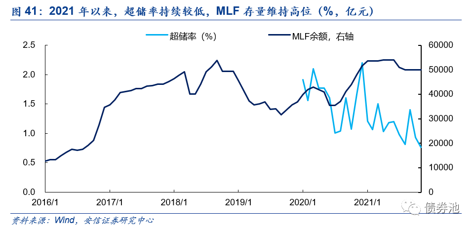 2021年以来,超储率水平持续偏低,在超储率较低的背景下,宽信用需要央行降准提供基础货币支持,同时MLF存量规模持续处于5万亿附近的较高水平,较高的MLF存量也需要降准置换。