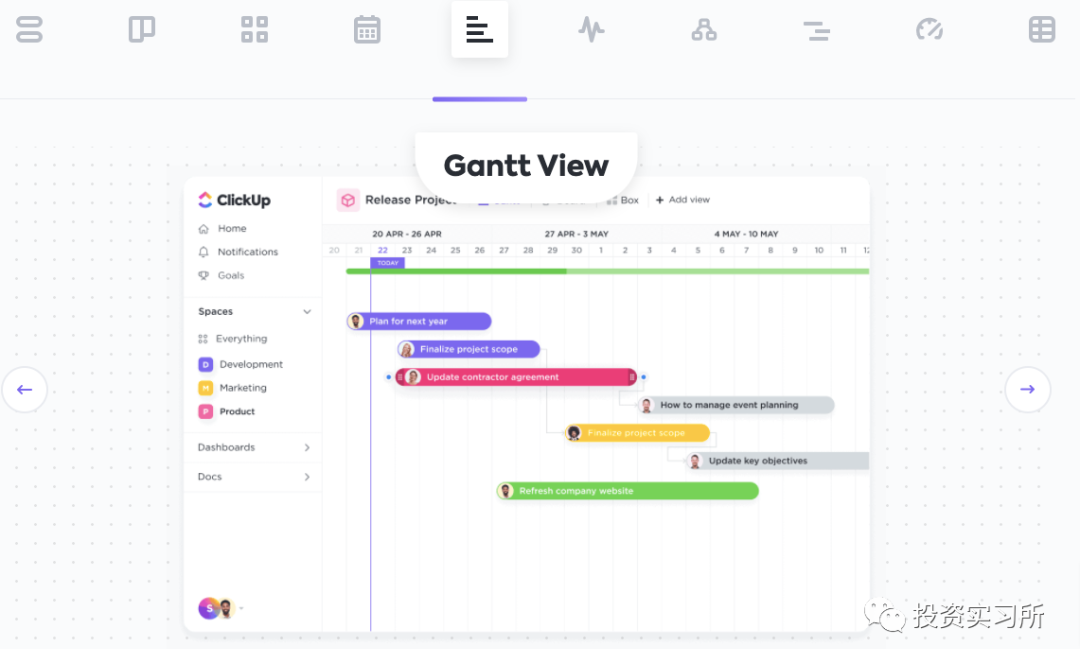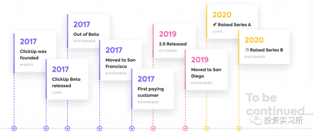 ClickUp 成立于 2017 年,直到 2020 年才第一次融资,其目标是用一个 App 取代所有单独的生产力工具,一开始提供的就是 All-in-one 解决方案,不希望人们在不同工具之间切换来切换去,进而节约时间,实现真正生产力的提高。