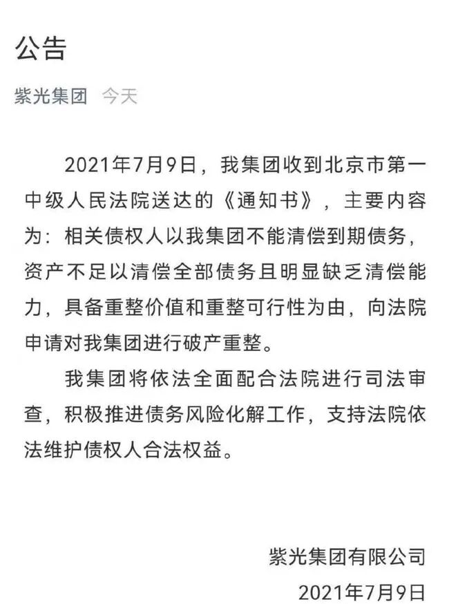在公告中,紫光表示集团已经收到北京市第一中级人民法院送达的《通知书》,相关债权人以集团不能清偿到期债务,资产不足以清偿全部债务且明显缺乏清偿能力,具备重整价值和重整可行性为由,向法院申请对集团进行破产重整。