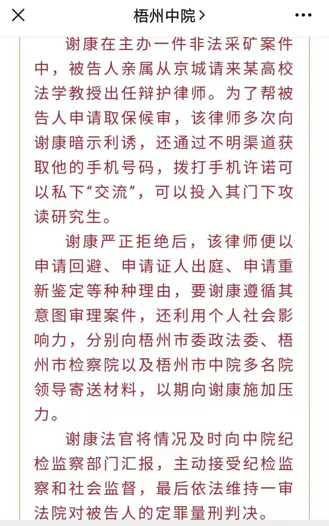 2021年1月25日,“梧州中院”公号发布《谢康,“鸡蛋里挑骨头”的扫黑先锋》的文章,提到: