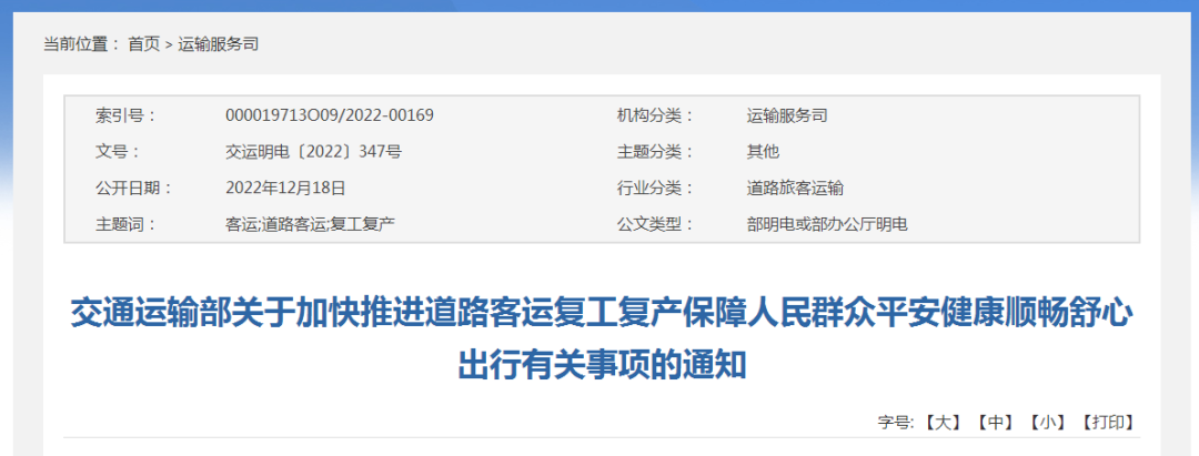 近日,交通运输部发布关于加快推进道路客运复工复产保障人民群众平安健康顺畅舒心出行有关事项的通知。通知提到,全面恢复道路客运服务,切实维护本辖区内道路班车客运、包车客运正常运行秩序。严格落实对旅客不再查验核酸检测阴性证明和健康码、不再开展“落地检”、不再进行信息登记等相关规定,为人民群众出行创造良好环境。