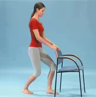 Stand with one foot on a step or on the floor in front of you, heel pointing up. Lean forward keeping your back straight. Hold for 30 seconds, then repeat on the other side.
