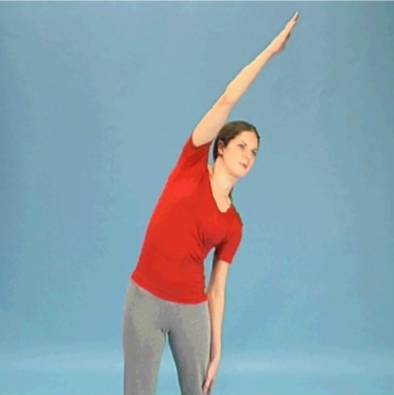 Stand straight with one hand on your hip and the other straight up. Reach your raised arm over to the opposite side. Keep your pelvis in mid-position. You will feel the stretch in the side of your trunk. Hold for 20 seconds, then repeat on the other side.