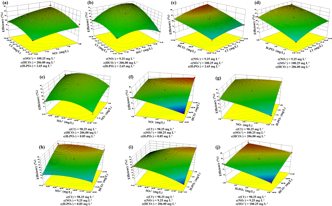 图3. 外来离子(Cl-、NO3-、SO42-、HCO3-和H2PO4-)对P25M175降解CQ的响应曲面图