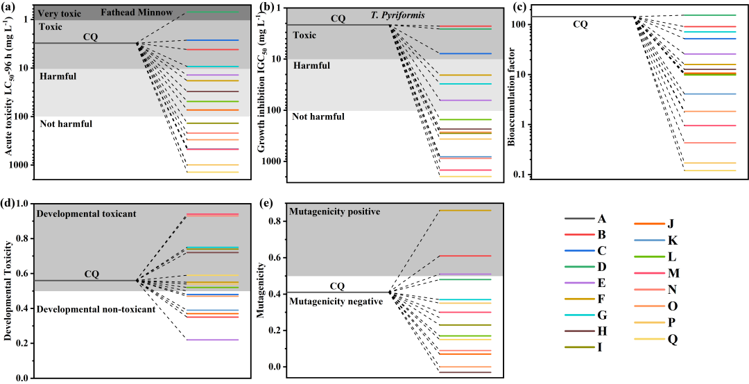 图7. CQ及其降解产物的(a)黑头软口鲦的半数致死量(96 h),(b)梨形四膜虫半数生长抑制浓度(48 h),(c)生物富集因子,(d)发育毒性和(e)致突变性。