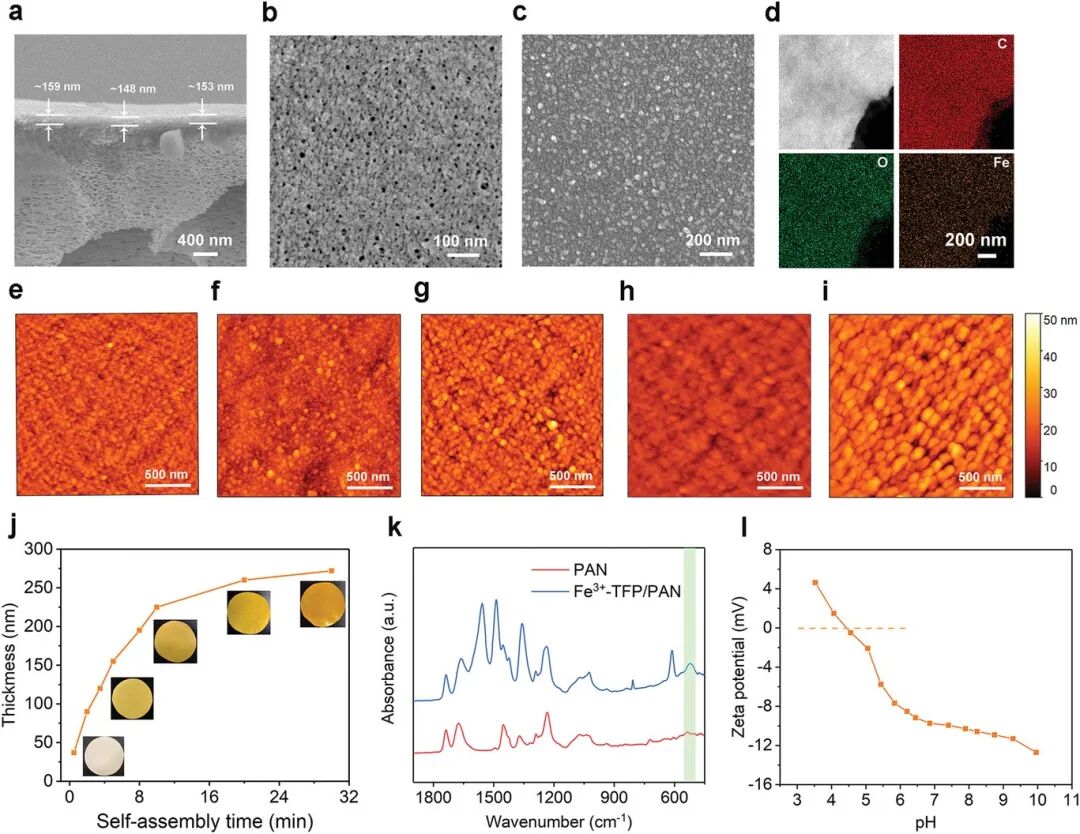 在接下来的实验中,作者在聚丙烯腈(PAN)基底上通过原位界面自组装策略构建了金属-TFP复合膜。这种原位组装策略被认为可以有效提高金属-TFP纳米薄膜与PAN基材之间的粘合强度,确保在实际错流操作条件下具有足够的稳健性。如图3a-c所示,很明显自组装膜是由多孔支撑膜顶部相对致密的薄膜(≈ 155 nm)构成的,这意味着在PAN上成功形成了Fe3+-TFP活性层基质。ATRIR光谱(图3k)也证明了Fe3+-TFP层的生成。分离的Fe3+-TFP层的EDX映射分析表明,Fe分布图与HAADF图像和C、O分布图相当匹配(图3d)。该结果表明,Fe3+与TFP协调并均匀分布在Fe3+-TFP层中,并且PAN衬底的参与不会改变Fe3+-TFP层的组成均匀性。更有趣的是,从表面AFM图像(图3e-i)发现,Fe3+-TFP层的表面球状结构的尺寸随着自组装时间从0.5分钟延长至10分钟而逐渐增加,这意味着Fe3+-TFP层的更交联和更致密的结构。同时,Fe3+-TFP层的厚度也从≈ 37 nm增加到≈ 220 nm (图3j)。发现组装时间的进一步延长导致膜厚度的缓慢增加,这证明了金属协调界面组装的自我完成和自我限制特性。通过Zeta电位测量进一步确定了Fe3+-TFP/PAN复合膜的表面电荷特性。如图3l所示,复合膜在pH为7.0时带负电,其等电点为4.5。这可能是由于Fe3+-TFP层表面上TFP的未配位酚羟基的解离引起的。