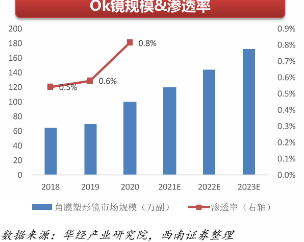 前面说到,2021年我国OK镜的销售总量大概在280万-300万副之间,这里再补充到,因为青少年近视的人数越来越多,预计2030年OK镜渗透率或达到10.66%,市场规模为140.26亿元。
