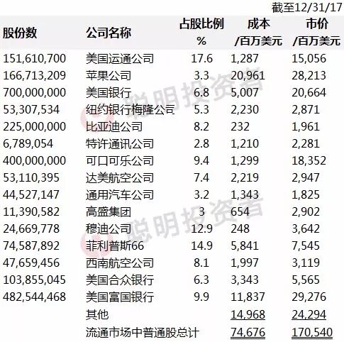 下表中,我们列出了截至2017年年末持有市值最大的15只普通股投资。 我们没有把我们持有的325,442,152股卡夫亨氏公司股份包含在内,因为伯克希尔是控股集团的一部分,因此必须用“权益法”来披露这项投资。 在其资产负债表上,按照一般标准会计准则(GAAP)计算,伯克希尔持有的卡夫亨氏公司股份的公允价值为176亿美元。截至2017年年底,这些股票的市值为253亿美元,伯克希尔•哈撒韦公司计入的进账成本为98亿美元。