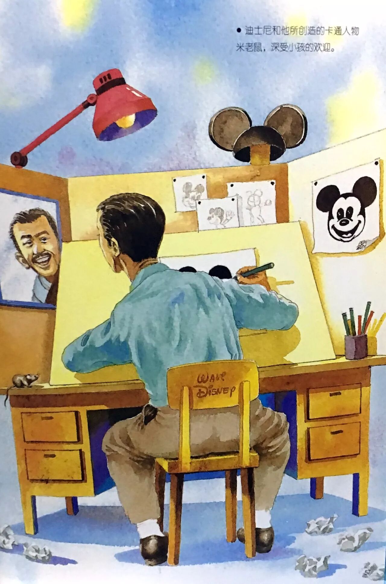 和卓别林同时,还有一位很有名的人,叫迪士尼。迪士尼不是演员,却创造了很多令人喜爱的演员,有的小孩可能很容易猜得出来,它们就是米老鼠、唐老鸭和白雪公主。迪士尼年轻的时候,生活很穷困,在他破旧的房子里,有一只小老鼠经常陪伴他工作,后来迪士尼就以它为主角,拍了一部卡通影片,它也就是人见人爱的米老鼠。