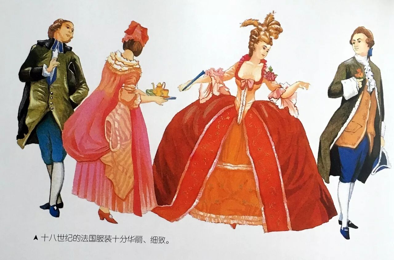 路易十四时的法国,是欧洲最繁荣富庶的国家,为了夸示它的富庶、强大,法国贵族的服装极尽奢华。他们的衣服上布满宝石、刺绣,而袖子及身上还加上衬垫,使人看起来更为丰满圆润。为了显出裤、裙上的装饰,女人在裙子里装上鲸鱼骨制成的衬裙架,把裙子撑开,这就是所谓的大蓬裙。穿大蓬裙很不方便行动,有的人则只把臀部撑高,再配上插着鸵鸟毛和孔雀毛的头饰,看起来十足像只大公鸡。男人也用骨架或衬垫把裤子撑得圆鼓鼓的,据说,这样才能表现出男人的气概。