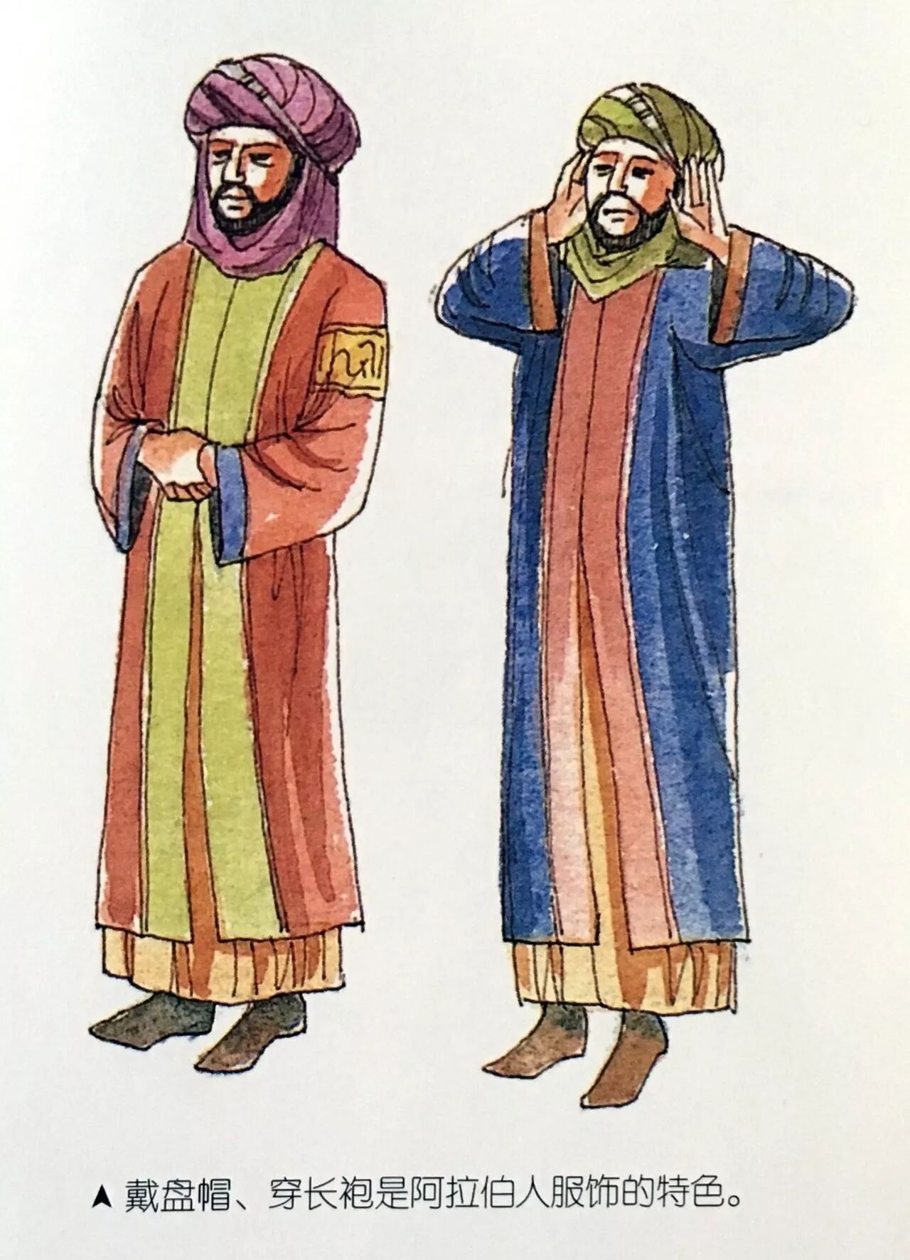 古代东方人的服装则不大相同。如果你看过《一千零一夜》的故事,对阿拉伯人的装扮大概就不会太陌生。他们穿着长袍、灯笼裤,束上腰带,再套上一件长外衣,头上还盘着布巾。阿拉伯妇女为了不让男人看到她的脸,都蒙上一层面纱,只露出一对眼睛来。阿拉伯人还发现棉花的棉籽茸毛可纺成纱,织成棉布。为了使衣服变得更漂亮,还发明了在白布上印花纹,这就是所谓的印花布。