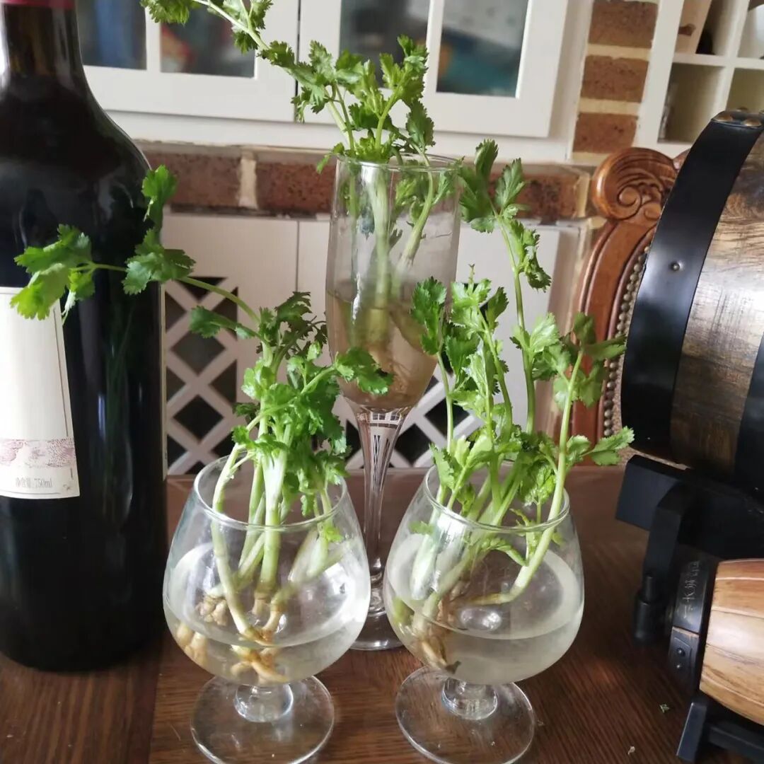 生活里总有一些瞬间让你心头铺陈柔软,并且分行就如诗。正好我用了红酒杯水培蔬菜,在此可敬你三杯青绿。
