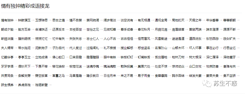 https://www.jiuwa.net/chengyu/jielong/ 每点击一个字会生成以这个字开头的成语可以连续几十个成语。