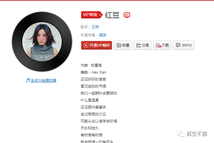 天后已经很久不出专辑了,自从去年发了一首单曲《我和我的祖国》快过去一年了,不过即使20年前的歌今天依然在传唱 王菲51岁:爱她,不只是因为她的歌,比如《红豆》 https://music.163.com/#/song?id=299936,可惜目前在网易云音乐需要VIP才能听,如果想听看看之前的文章一键解锁网易云音乐变灰歌曲