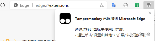 如果谷歌商店打不开就只能手动安装了,输入 edge://extensions/ 进入扩展管理页面, 跟谷歌浏览器手动安装一样开启开发人员模式,将下载的扩展crx文件拖进去就是 。很快就安装好了,现在就可以去安装油猴脚本了。