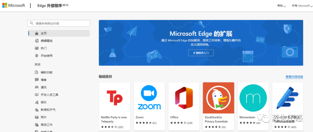 和谷歌一样edge也有自己的扩展商店,国内用户可以直接访问这个商店,不过目前扩展还比较少 https://microsoftedge.microsoft.com/addons/Microsoft-Edge-Extensions-Home?hl=zh-CN