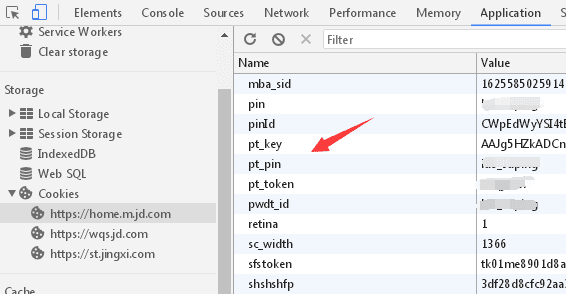 先登录京东账号获取cookie https://home.m.jd.com/myJd/newhome.action?sceneval=2&ufc=& ,复制application里pt_key和pt_pin的cookies值。