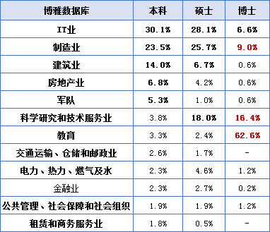 硕士主要从事:IT业、制造业、科研、教育、金融、公共管理。