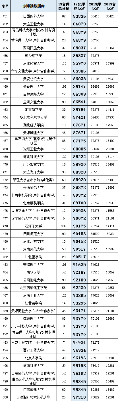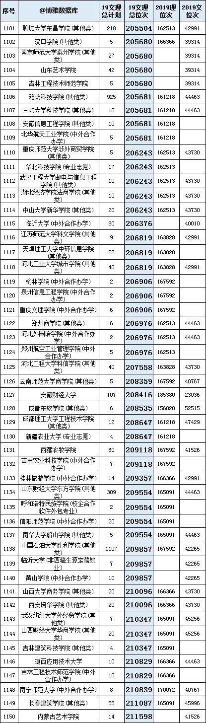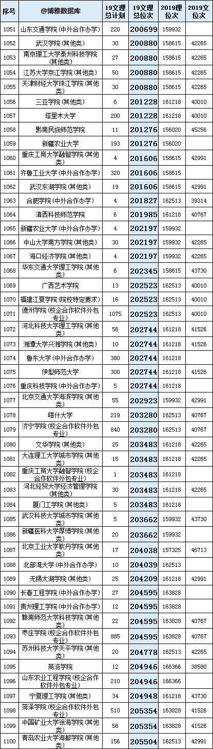 下表为2019高考(文史+理工)合并位次,部分院校文史、理工未招生的,已对位次进行修正。