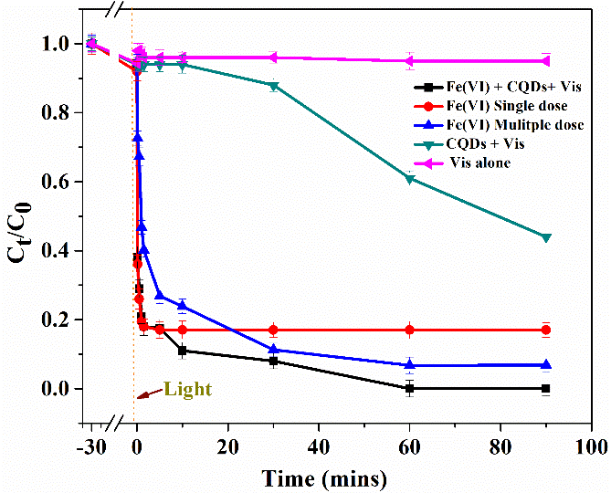 图3.高铁(VI)(0.2mM)和CQDs(0.02mg)在相同反应条件下的不同体系的降解曲线(0.02mM的2,4,4'-HBP,pH =8.0,温度为25℃),Vis代表可见光照射。在单剂量法中,在一次剂量中一次性添加全部量的氧化剂。在多剂量法中,将高铁酸盐溶液的总量分成五等份,然后依次添加。