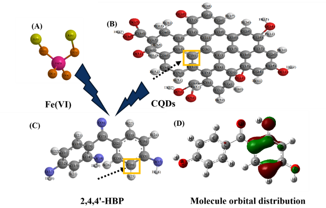 图4. CQD和2,4,4'-HHB的 DFT分析。(A) 高铁酸盐结构;(B)CQDs结构;(C)2,4,4'-HHB结构,而黄色框表示2Fed2HOMO值,以及(D)表示2,4,4'-HHB的分子轨道分布。