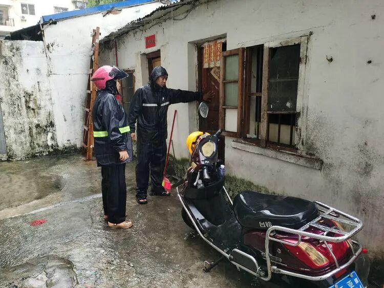▲区行政审批服务局到机场路社区检查指导防台防汛工作,协助转移低洼地带群众。