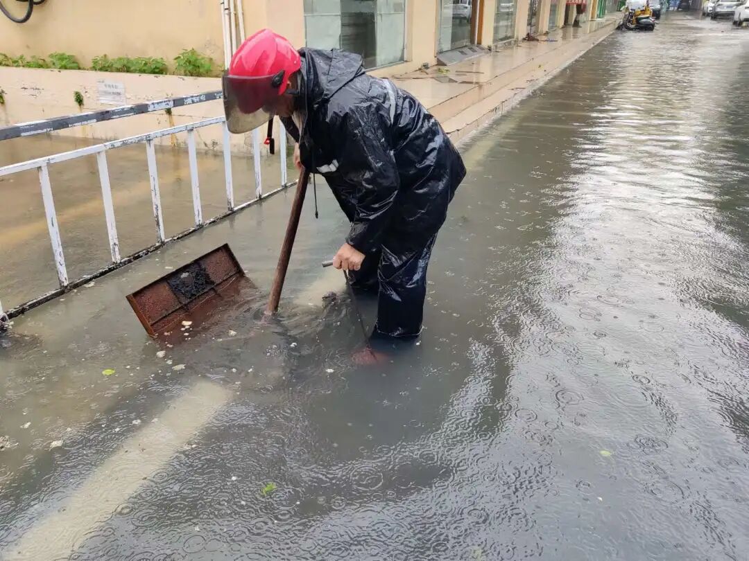▲儋州村社区网格员检查主干道的井盖、地漏、排水管道,并进行疏通清理。