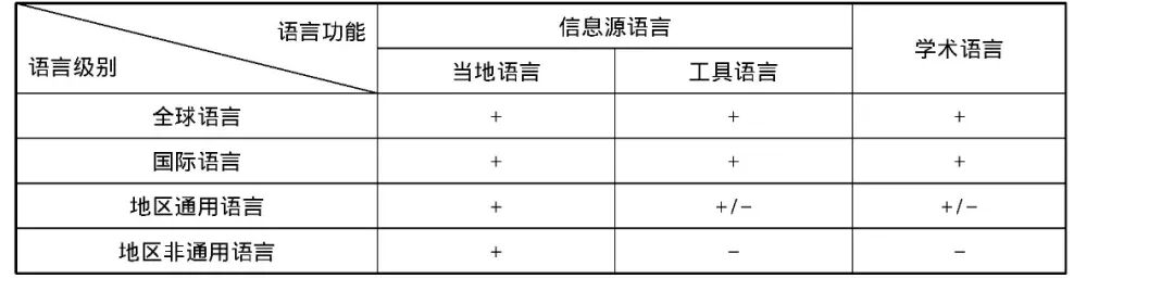 在多语能力体系中,不同级别的语言发挥不同功能,语种范围各有不同。(1)全球语言,当下非英语莫属,英语正充当着世界共通语的作用,不仅使用人数众多,也是互联网、大众媒体、科学发表、商贸交流、国际公务中使用最广泛的语言。(2)国际语言,指拥有国际影响力、在学术领域作用突出、能够代表重要文化区域和学术传统的语言,主要包括联合国官方语言中的汉语、法语、俄语、西班牙语、阿拉伯语,德语也应属此类。(3)地区通用语言,指在某个地理或文化区域内地位和通用度较高、可作为族际交际语的语言,如葡萄牙语、希伯来语、印地语、孟加拉语、乌尔都语、斯瓦希里语、马来语、泰米尔语等。(4)地区非通用语言,指使用人数较少的语言,包括除以上三类语言之外的所有语言。这类语言数量最大,地方色彩最浓,影响力大小不一,言语社区的边界相对更清晰,不少语言甚至没有书面语,可能处于濒危状态。