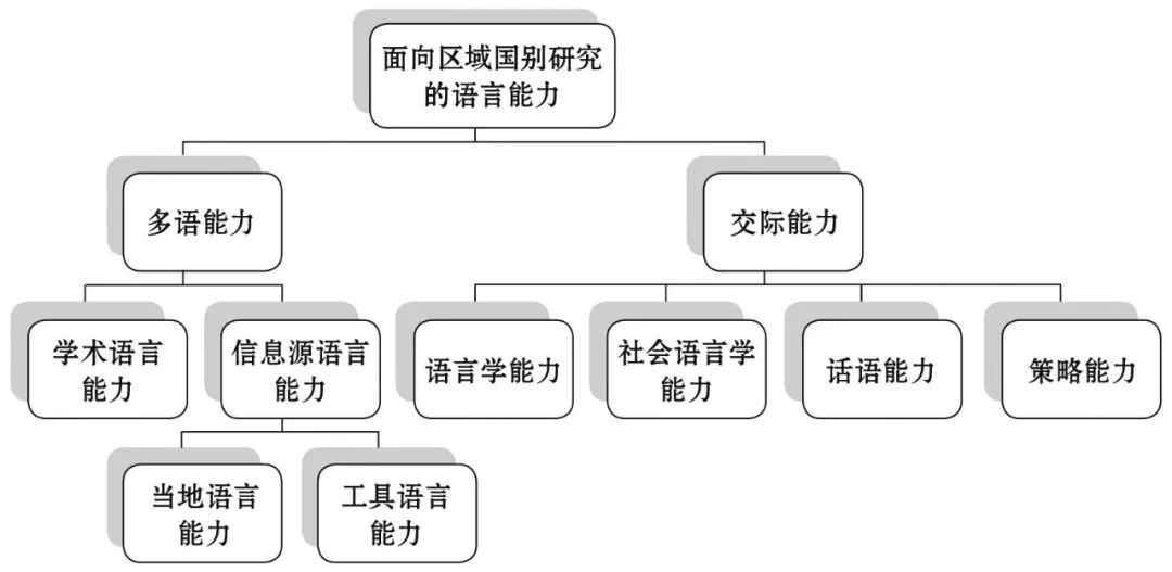 区域国别研究的目标和内涵决定了研究的复杂性,它“以实体研究对象为核心,以满足国家对外交往需求为目标,集中现有学科体系内人文社会科学的研究力量对海外知识进行发掘梳理和组织整合”(罗林,邵玉琢 2019:148)。因此,区域国别研究者需要具备特定的能力体系。以下分别论述区域国别研究的能力体系以及语言能力在其中的地位。
