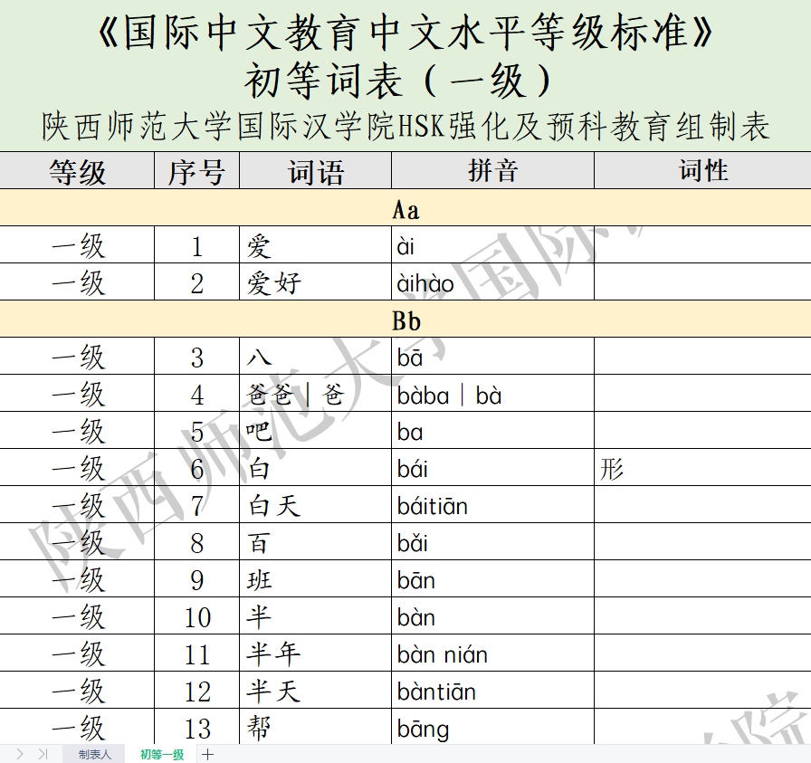 2.系列表格按照《国际中文教育中文水平等级标准(2021)》、由陕西师范大学国际汉学院HSK强化及预科教育组独立制成,是为方便汉教届师生检索而特别推出的教学材料,免费提供,欢迎转发、下载!但请务必尊重《标准》的知识产权及老师们的劳动成果,任何单位和个人不得用于盈利,若出现不当行为,我们将保留追责权利,感谢大家的理解。