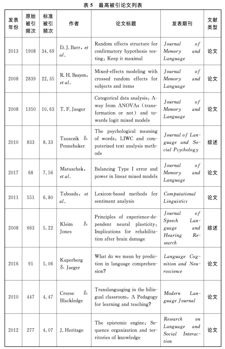 (3)心理语言学类期刊占比大。十篇最高被引论文中,有七篇为心理语言学类期刊发表的论文。这一发现也部分验证了4.2小节的结果,即心理语言学期刊入选高被引论文的几率较大。与语言学类期刊论文相比,心理语言学期刊论文有更多被引的一个可能原因在于,心理语言学期刊论文更多受到来自于心理学、教育学、神经科学、认知科学等领域学者的关注,其引用来源量更大、来源面更广。