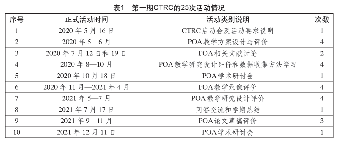 表1第一列“序号”表示两年中的10类活动的序列;第二列“正式活动时间”指的是CTRC全体成员集中活动的时间;第三列“活动类别说明”指的是每类活动的内容;最后一列“次数”指的是正式活动的次数,例如POA教学录像评价为4次,表明CTRC全体成员在集中活动中开展了4次教学录像评价。