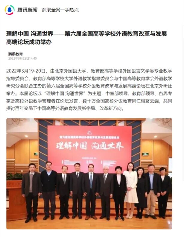 3月19-20日,以“理解中国 沟通世界”为主题的第六届全国高等学校外语教育改革与发展高端论坛成功举办。论坛全程线上直播,全国多所高校组织外语院系教师集体观看,数十万外语教育同仁云端相聚,凝聚发展共识,展望前行方向,共促中国高等外语教育改革与发展。
