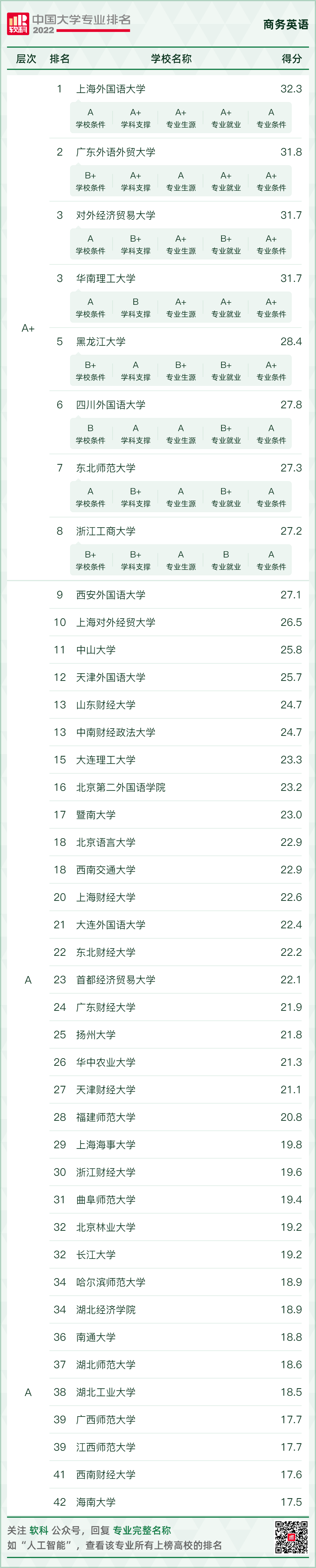 2022年6月18日,高等教育专业评价机构软科今日正式发布2022“软科中国大学专业排名”。排名包括568个本科专业,每个专业榜单发布的是所有开设该专业的高校中排名位列前50%的高校,共有990所高校的30242个专业上榜。“软科中国大学专业排名”是迄今为止覆盖专业数量最多、参评专业规模最大的中国大学本科专业排名。