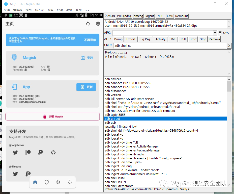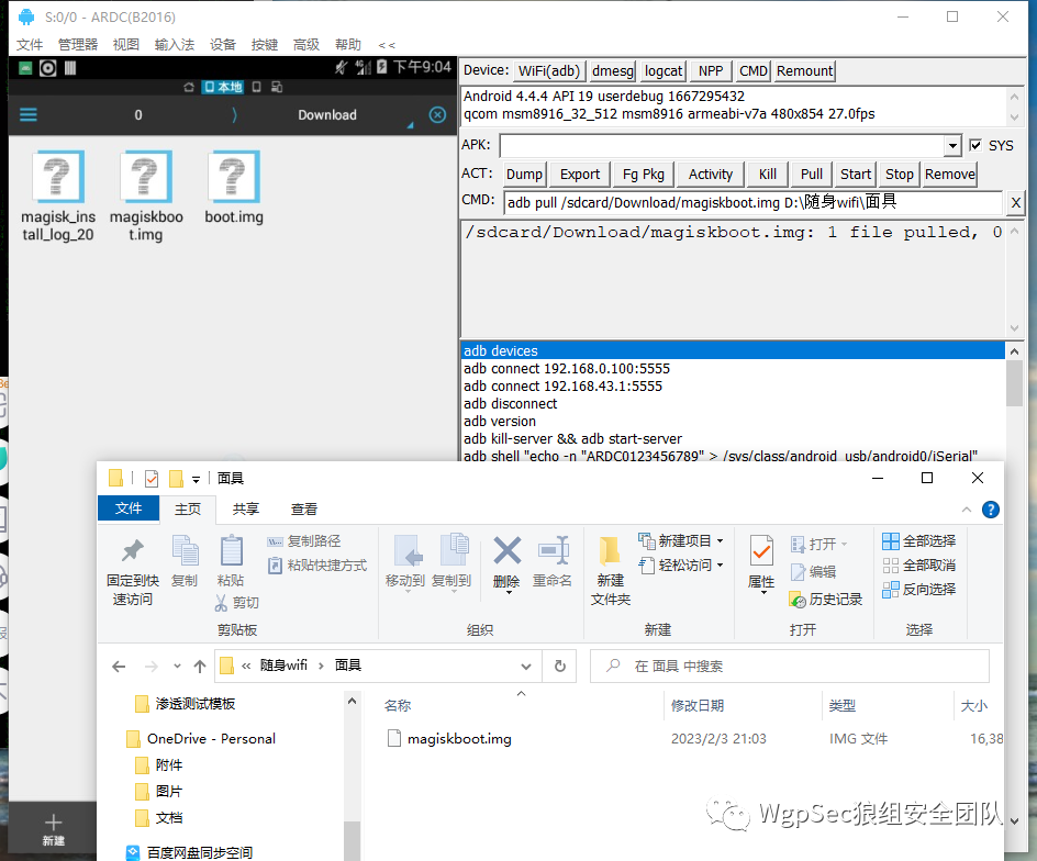 等待完成即可,后面就是直接安装es文件浏览器和面具(最先安装桌面也就是Launcher.apk,不然我们是没有可视化桌面的),安装好后打开es文件浏览器进入到下载文件夹中将我们的备份文件中的boot.img拖拽进去(这里的投屏软件是ARDC),然后打开面具,开始安装->选择修补文件->点击我们上传上去的boot.img->开始->等待完成即可,然后会在下载文件夹中生成一个修补好的文件,我们重命名为magiskboot.img,然后使用命令