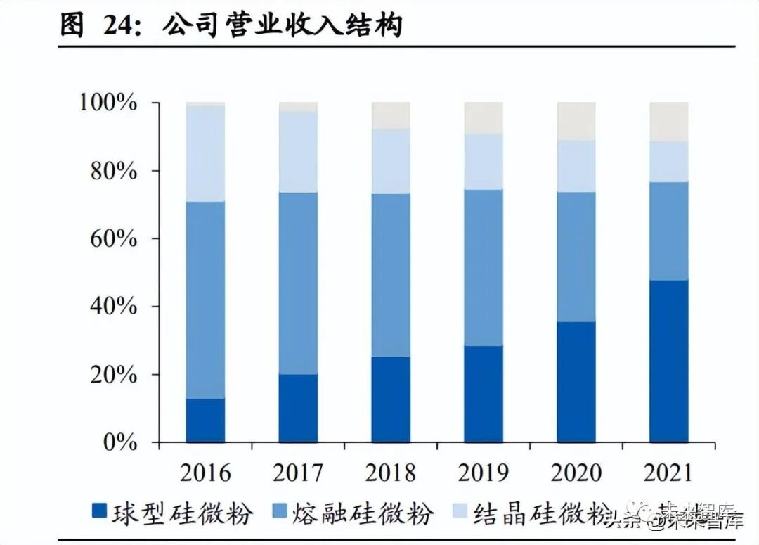 国内硅微粉行业龙头,深入布局粉体材料强化龙头地位。公司主营业务包括以结晶、 熔融、球形硅微粉为代表的硅微粉,以及球形氧化铝等其他粉体材料。公司凭借球 化领先技术,布局硅铝类粉体材料,未来储备其他新品类,奠定国内球粉细分龙头 地位,并在国际市场逐渐体现出较强的竞争力。目前公司球硅产品已经通过了三星、 住友、KCC 等下游头部客户验证,进入快速放量阶段,球形产品放量将带来公司整 体产品结构的改善和盈利能力的较快提升。