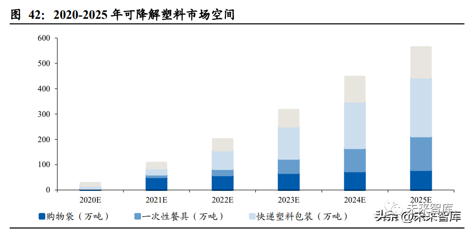PLA 应用成熟、符合碳中和大势,是可降解材料的主流方向之一。据中国化信,2025 年国内可降解塑料市场规模保守可达 561 万吨,其中 PLA 规模约为 180 万吨(按 32%比例估算),扩张弹性大。PLA 生产的碳排放显著低于传统塑料。另外据 TotalCorbion,每生产 1 千克 PLA 仅产生 0.5kg CO2,远低于 LDPE、PS 及 PET 的碳排 放。PLA 的全球变暖潜能值(GWP)较低。一方面农作物原材料在成长过程中光合 作用吸收 CO2,一方面副产物循环利用减少了 GWP,综合来看 PLA 推广非常符合 碳中和趋势,我们认为其属于可降解材料的长期主流品种。