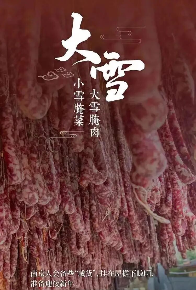 腌肉、打雪仗、赏雪景、进补都是大雪节气民俗。在中国的南京有句老话,叫做“小雪腌菜,大雪腌肉”。此时,家家户户门口,窗台上都会挂上腌肉、香肠、咸鱼等腌制品,形成一道亮丽的风景。如果此时恰逢天降大雪,人们都会热衷于在冰天雪地里打雪仗、赏雪景,其乐融融。