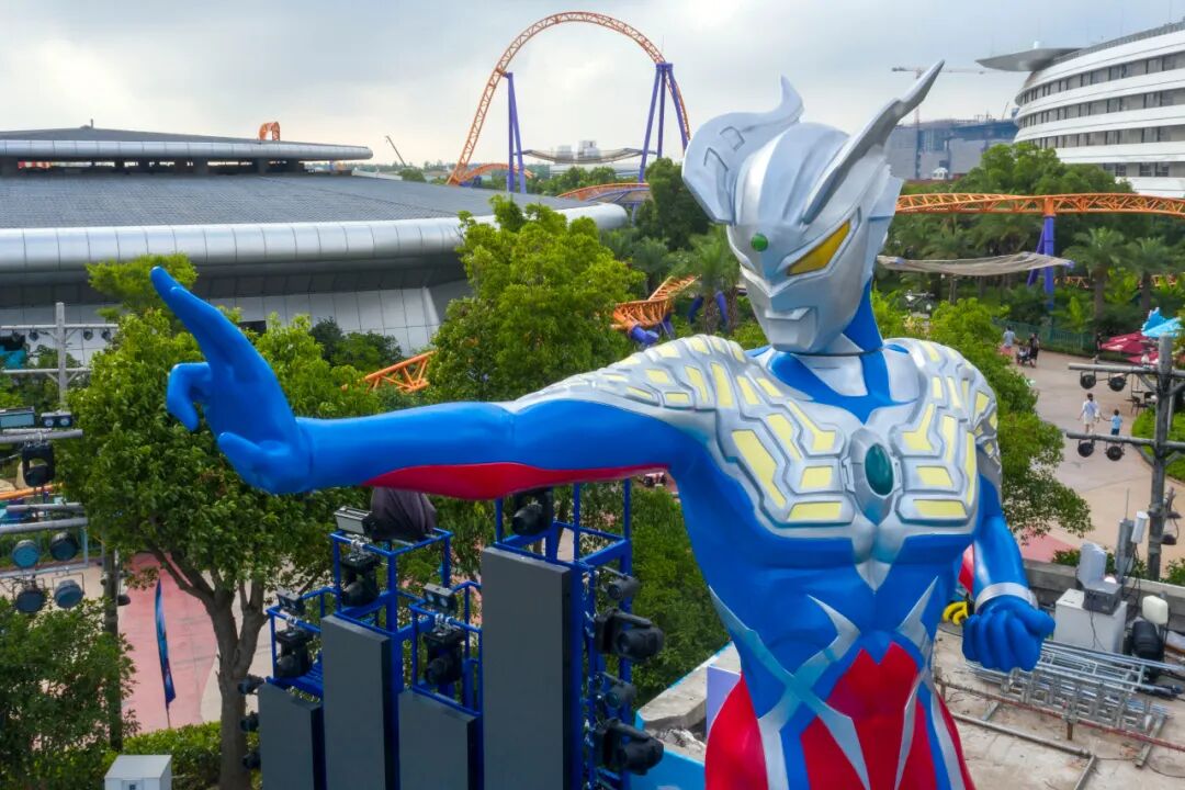 2021年11月,曲乃杰在上海浦东新区参加海昌海洋公园和金桥集团的一个战略合作签约仪式,正式启动了金桥城市副中心的建设,涉及14个具体重点项目,总投资超450亿元。在此之前,海昌海洋公园刚刚于10月份公告了重大出售事项,试图通过出售旗下位于武汉、成都、天津和青岛的4个主题公园100%股权,以及位于郑州的1个主题公园66%的股权,获得65.3亿元现金回流,为公司偿债续命。此次资产出售确实给上市公司带来了一线生机——完成重整的2021年末,海昌海洋公园的带息债务减少了40亿元,资产负债率从81.7%降至67.3%,货币资金则多了8亿元,明显宽裕了不少。全年净利润也因为出售资产带来的27亿元非经常性损益,实现了扭亏为盈。在此之后,公司在2021年12月首次发布了和新创华文化发展有限公司的合作,宣布签下奥特曼IP的授权。公告显示,引入奥特曼IP后,除了现有的12米高赛罗奥特曼,上海海昌海洋公园还将落地奥特曼主题酒店、奥特曼主题餐厅、演出剧场等主题内容,同时开发并销售一系列以此IP为基础的限定商品。(上海海昌海洋公园,室外巨大奥特曼模型 东方IC/图)