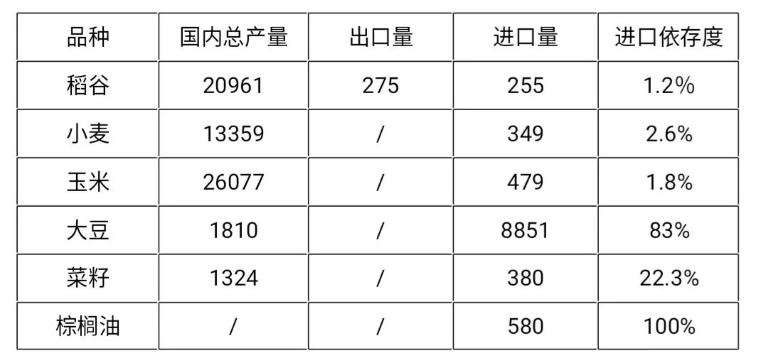 我们还是拿数据说话,请大家看一下表1。在6.64亿吨的粮食总产量中,三大主粮(水稻、小麦和玉米)的比例合计超过90%,达到6亿吨。而我们合计进口的稻谷、小麦和玉米只有1083万吨,不到国内总产量的2%。少量进口稻谷和小麦主要是补充细分市场的高端需求,并不是说中国存在2%的主粮缺口。4月4日,农业农村部宣布,小麦和稻谷的库存大体相当于全国一年的消费量——这相当于给民众吃了一颗 “定心丸”。其实中国的主粮可以实现自给自足,需要未雨绸缪的是油料作物。表1:2019年中国主要粮油产品的供需情况(单位:万吨)