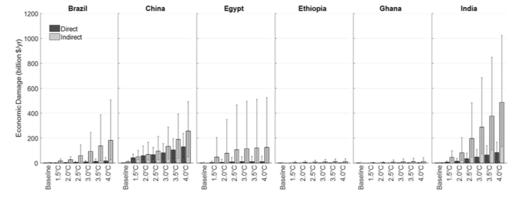 在基准情景(1961-1990年)和未来情景(2086-2115年),六国(巴西、中国、埃及、埃塞俄比亚、加纳和印度)在考虑社会经济增长与全球温升的不同情景下的洪灾直接和间接损失预测(其中,条形图代表五个模型集合的平均值,须线代表集合最大值和最小值)| 图源:文献[10]